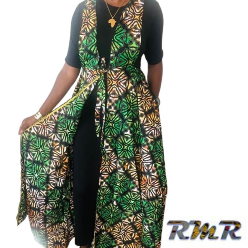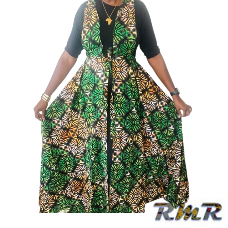 Robe en Wax très élégante de couleur verte. Ribe ouverte avec possibilité d’être porter fermé en cache coeur.