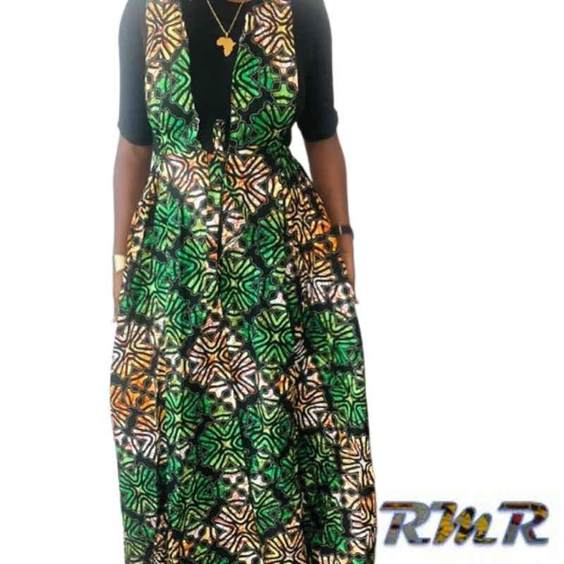 Robe longue : Robe salopette ouverte en wax de couleur multi couleur verte